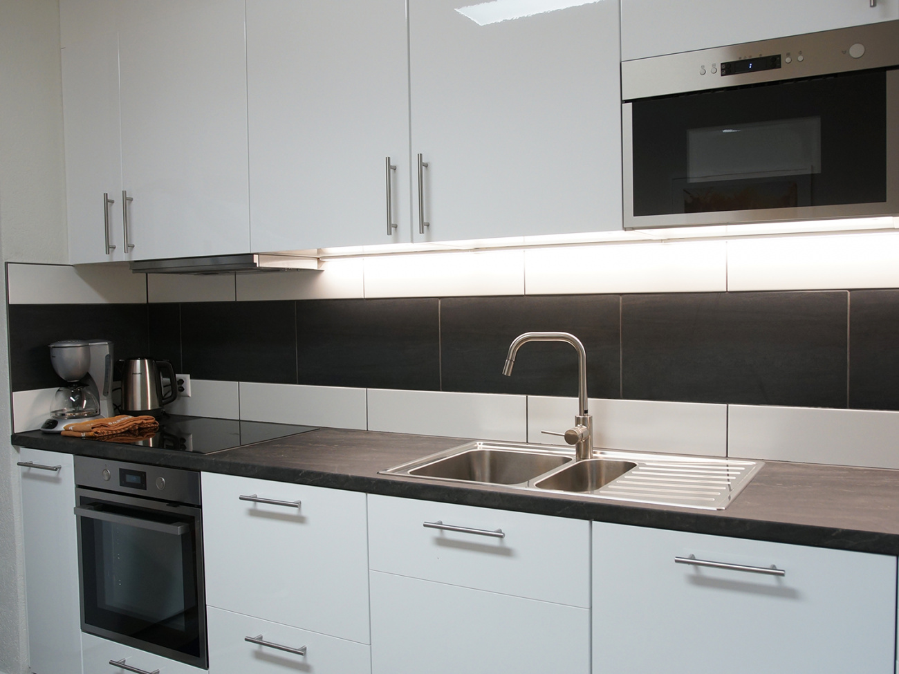 - Geräumige Küche mit kleinem Esstisch, Backofen, Mikrowelle, Geschirrspüler, Kaffeemaschine Nespresso (Kapseln können an der Réception gekauft werden), Filter-Kaffeemaschine (Filter 1×4), Toaster und Wasserkocher