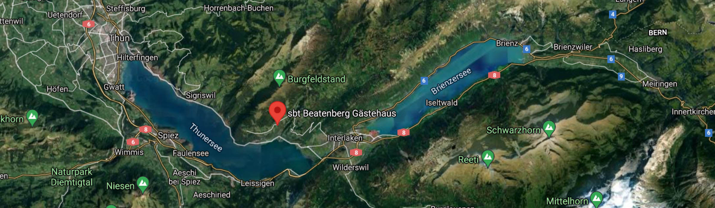 prenez l’autoroute A6 et A8 Berne/Spiez/Interlaken ou A4, A14, A2 et A8 Zurich/Lucerne/Brünig/Interlaken. A Interlaken West, quittez l’autoroute et suivez les panneaux pour Beatenberg. Beatenberg se trouve à 10 km d’Interlaken.